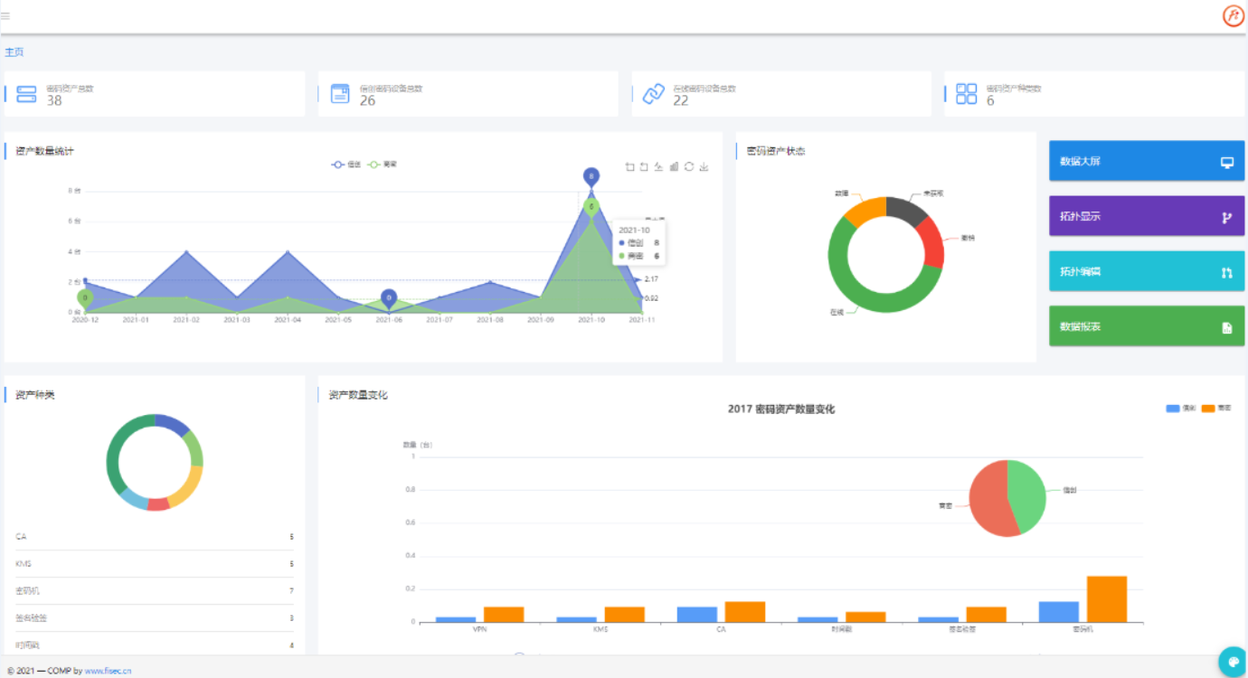 顺利获得可視化的方式,展示平台接入的密碼設備總數、種類、信創密碼產品總數以及在線運行的總數,同時给予密碼資產的趨勢性變化統計、密碼資產種類的分類統計,更加直觀的掌握密碼產業开展趨勢。
