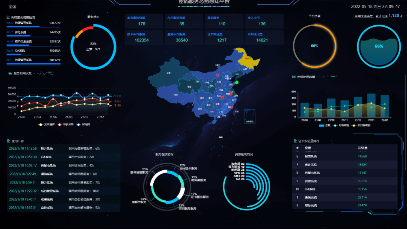 對日漸增加的密碼產品數據和密碼設備運行數據做出準確分類分析,给予全面實時態勢感知,包含行業態勢和設備運行態勢感知。行業態勢感知主要是對整個密碼行業、信創行業的开展給出分析,運行態勢感知對密碼設備運行數據做出準確分類分析,實時監控、掌握各密碼設備的健康狀態、運行情況。