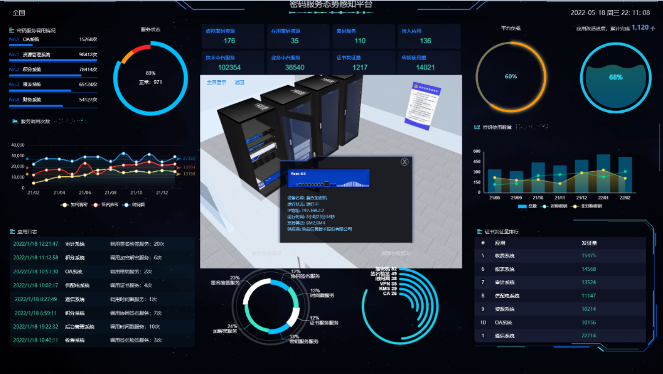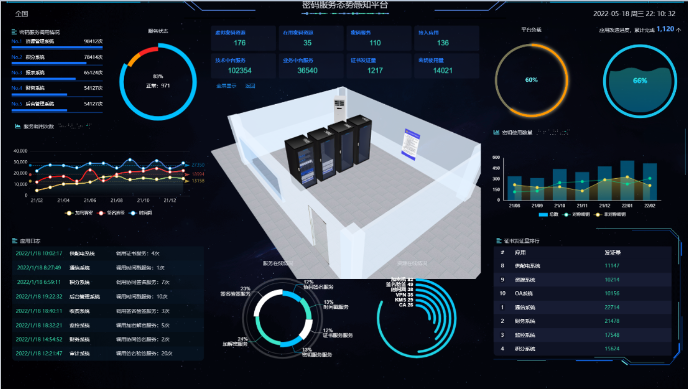 给予行業態勢感知和設備運行態勢感知內容呈現。行業態勢感知包含資產概況、資產數排行、資產類型、各地區密碼資產分佈、各類資產改造應用等,設備運行態勢感知包含設備總台數、資產在線比例、設備在線時長統計、設備分類信息統計、證書發放量、密鑰使用量等統計。