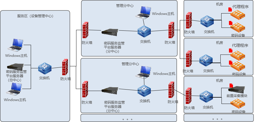 密碼服務監管平台部署於指定的設備管理中心單位,可以是國家級、省級或市級,用於監測下屬多個中心或機房中的密碼設備。